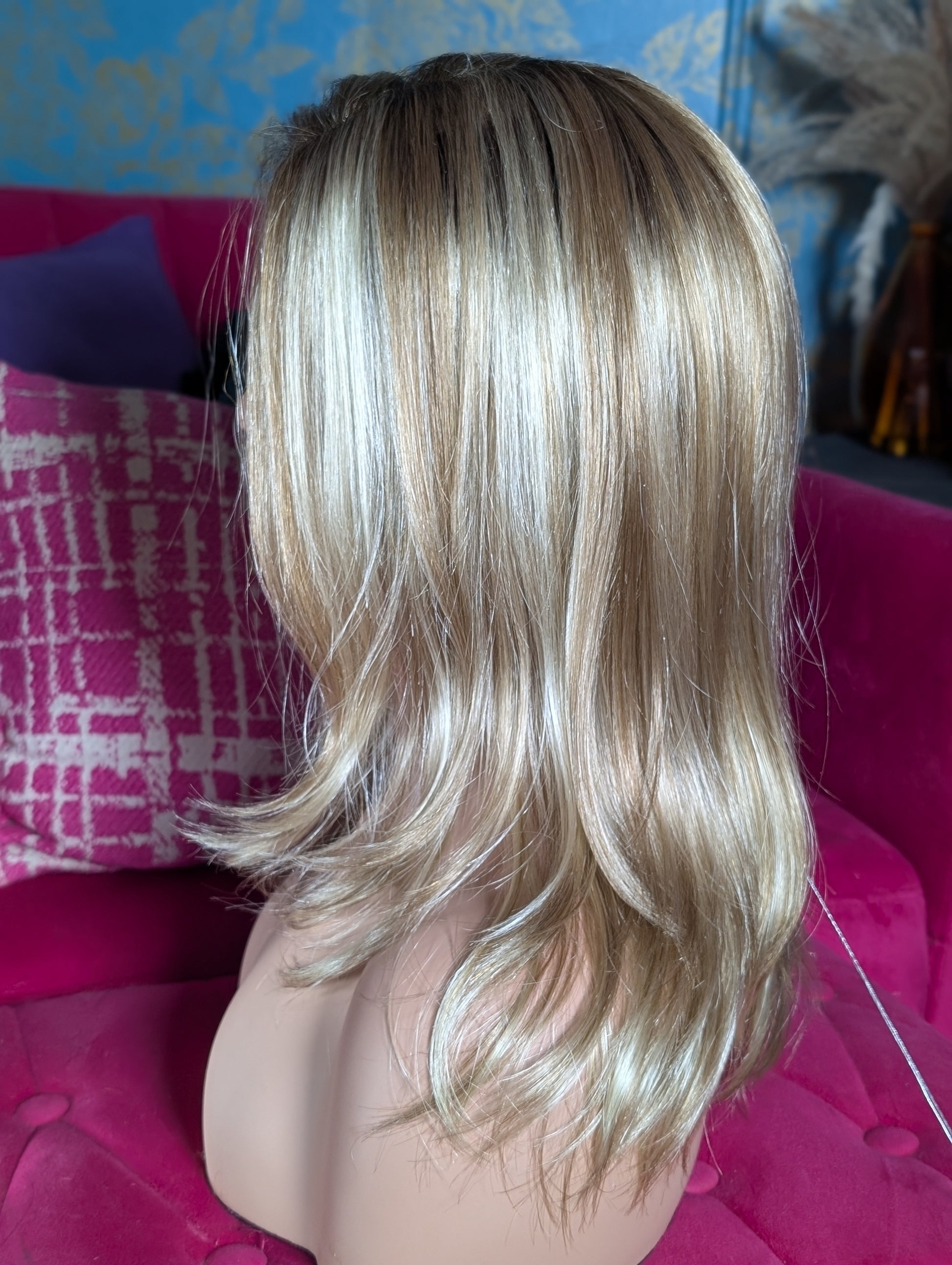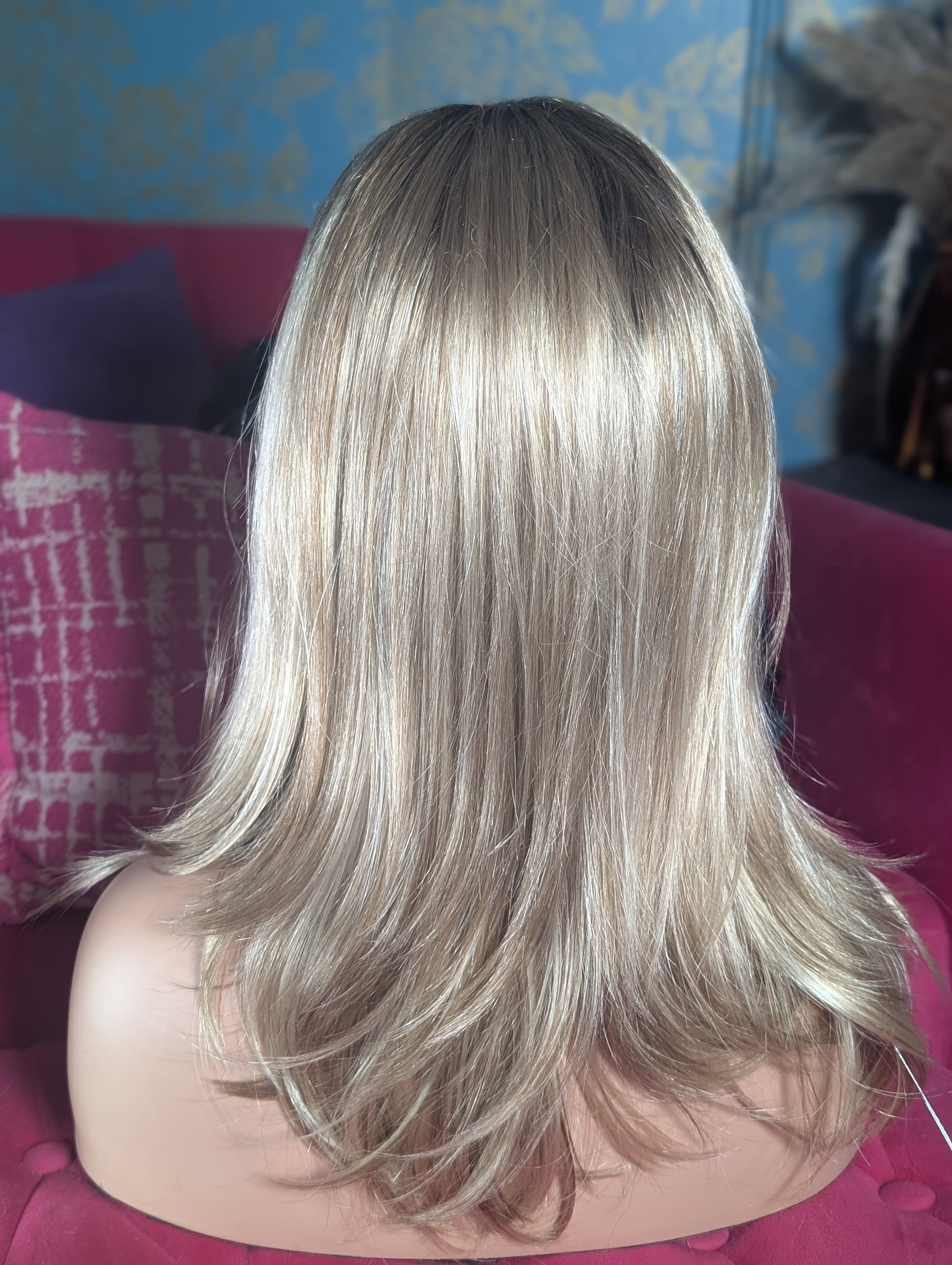 The realistic luster and the low density of hair match the density of fresh-cut fine human hair. Each strand of hair tapers from the crown to the ends for natural-looking hair that moves like a sheer cloud. Handcrafted double-knotted mono top and lace front will part anywhere for a realistic and undetectable hair line. Wear the versatile Bliss up, down, or pull back into an undetectable hairline pony.