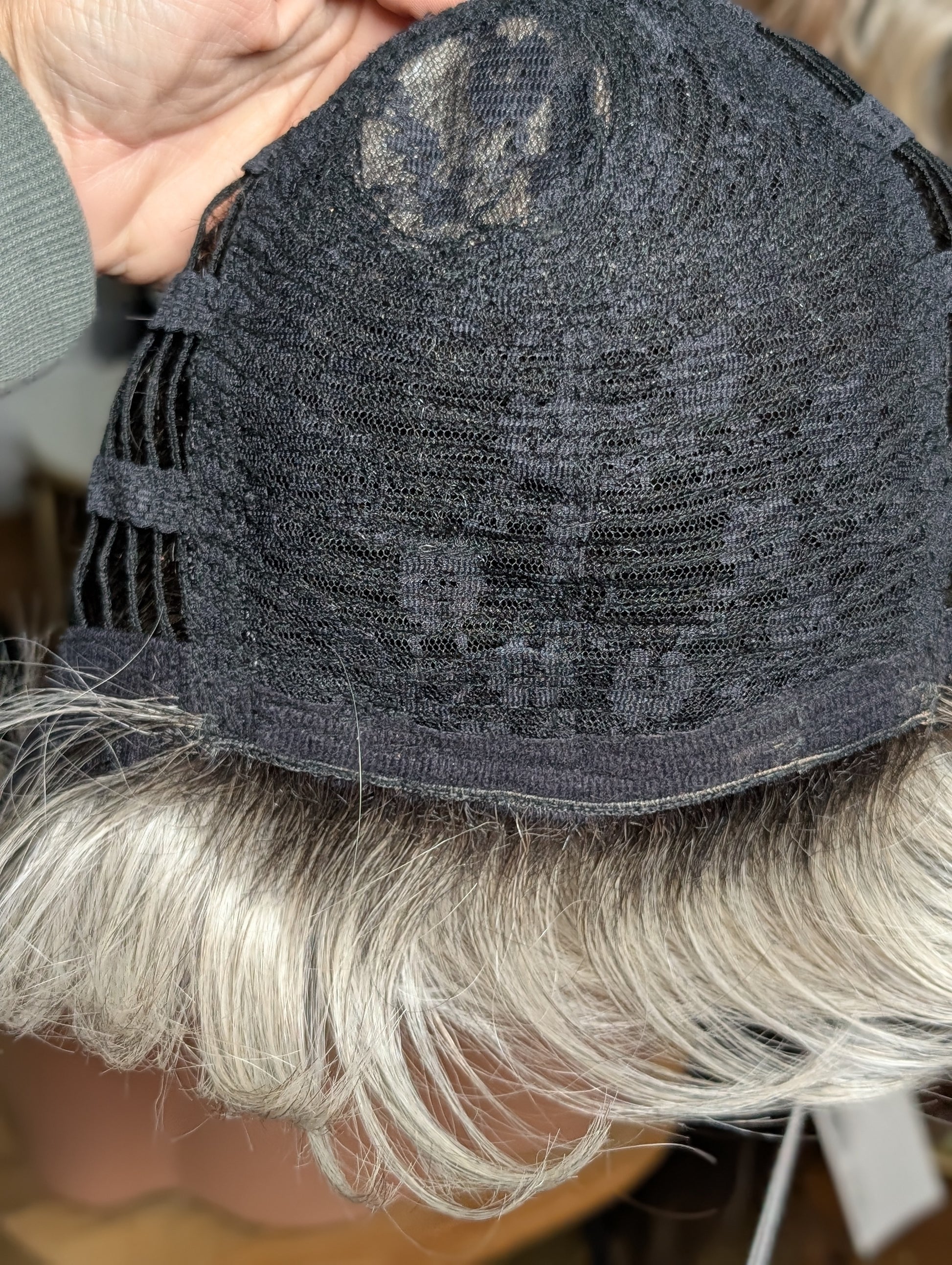 • Wefted cap features a wonderfully natural crown or “crest” area, where each and every hair has been individually weaved. This area varies on all models, depending on the style, it is usually either pointed or elongated. The wig looks particularly natural in areas where the skin is visible, as the weave of wig hair appears to flow directly from your own scalp, just like natural hair growth. The rest of this wig mostly consists of a wefted cap in which the hair is sewn into fine cotton tapes. Wefted caps adapt very well to the shape of the head and allow air to circulate.