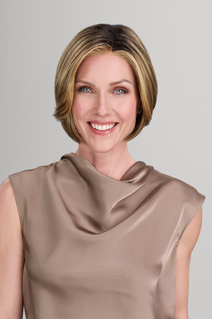Designed with a light density construction and an extended SmartLace™ lace front from ear to ear, Shelby offers realism in a chic, modern bob. Stacked layers at the back add dimension and movement, while the graduated silhouette creates a bold, contemporary profile. A monofilament top and wefted back deliver natural parting options, breathable comfort, and a secure fit. Shelby brings a fresh, dynamic twist to a timeless classic.