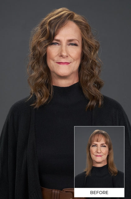 Designed for mid to progressive hair loss, the Top Trend Lace HD Wavy 14” topper blends effortless movement with innovative construction. Made with heat friendly fiber, this topper allows for versatile styling with hot tools, while maintaining its soft S-wave pattern-simply scrunch after washing to revive its shape. The extended SmartLace™ front creates a natural hairline, while the double monofilament top conceals the front clip for seamless parting. Machine-wefted sides and back add volume and coverage, while strategically placed clips provide a secure, comfortable fit. Top Trend Lace is available in grey shades, introducing Jon Renau’s first ever 18" grey topper.