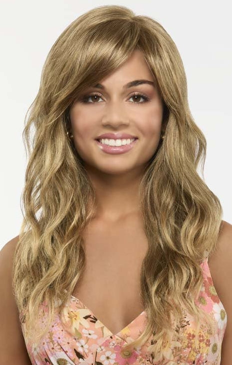 Vamp by Mane Attraction is a cascading, wavy style with elegant side-swept bangs. Features a lace front to let you easily style hair off the face with clips. A lace hair part lets the scalp peek through for a truly realistic appearance.